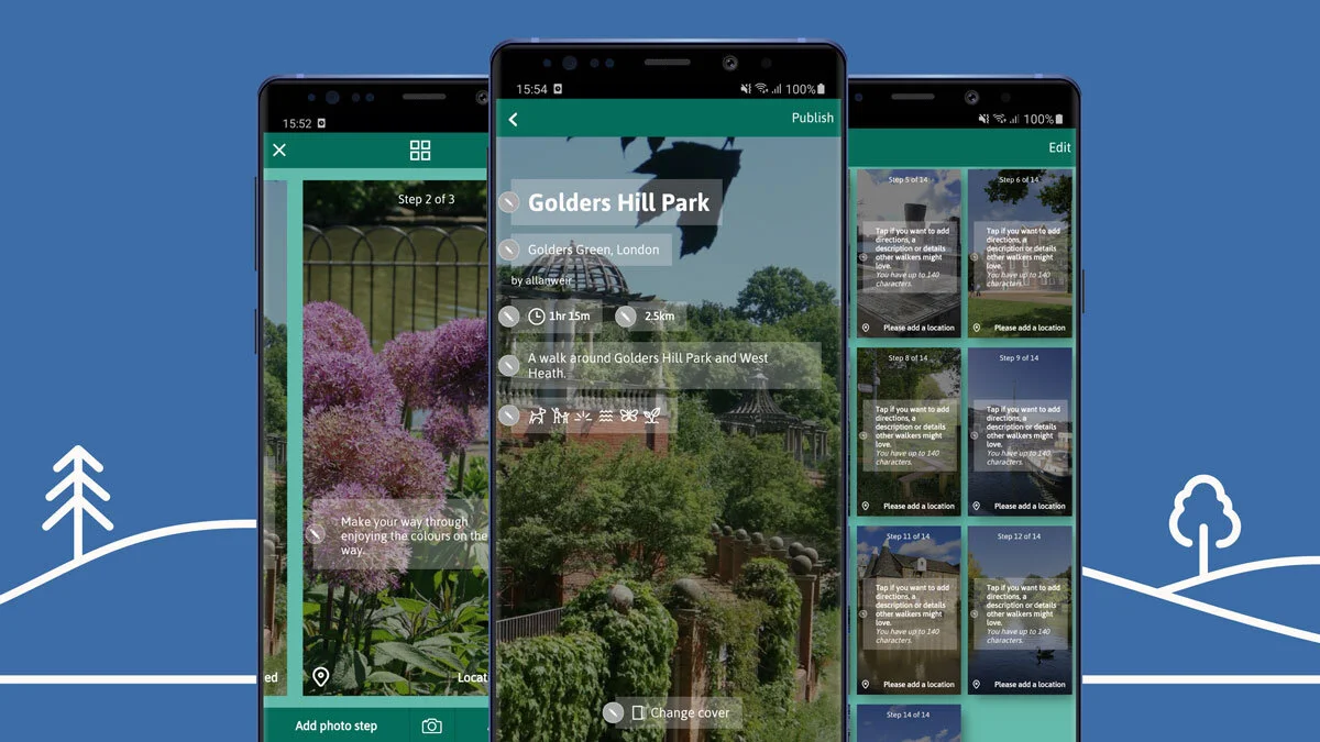 Getting started is simple. Make sure your location permissions are switched on for your Android camera, then take lots of pics of your walking route while you are out and about. At home, select your favourite photos and they will be automatically plotted on a map for you. You can add useful or interesting information to each step of the route, give it a title and short description, and even assign attributes like wheel-friendly and dog-friendly to make sure people know what kind of walk it is. Finally, publish it and share the link with your family, friends, and the rest of the Go Jauntly community. To share a walk, just tap the tree menu on the bottom right of any walk and choose share. For more tips on how to create a walk, check out our guide here.